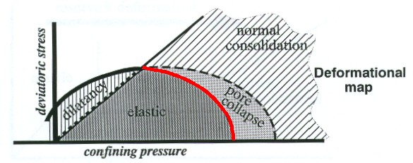 Okie, dokie!:オッキー・ドッキー。タミーがご機嫌なときに使う。体をくねくねしながら発音しなければいけない。ケビンによればOKの意味らしい。そういえば、ビバリーヒルズコップ3でエディーマーフィーも使っていた。 明日からRMRC/RMC Fall Meetingだ。スポンサーを招待しての発表会みたいなものだが、なぜかわからないが、Detournayが来るらしい。ベルギー出身でJCと似たような経歴だそうだから友達なのかもしれない。 写真を撮らせてもらおう。別刷りも用意して自分の研究の押し売りもしなければならない。私はバンケット(昔バブルの時期にバンケッターというのが流行った。今はコンパニオンというのか。コンパニオンアニマルといえばペットのことか。これは英語だろうか?)で、豊浜の件を発表することになっている。Detournayは聞いてくれるだろうか。 adjourn:アジャーン。閉会。ケビンに聞いたらよく使うといっていた。 oC:デグリーセンティグレード。デグリースィーという人もいる。 moduli:やっぱりモジュライだ。 MPa:メガパスカルというときもあるようだ。 こちらでは$150,000で死体を冷凍保存してくれる会社があって実際に4人が冷凍保存され、将来の医療の進歩を待っているそうだ。死んでから冷凍したってしょうがないような気がするが、生きているうちに冷凍されるのはやっぱりやだな。ここの社長は自分が死んだらやっぱり冷凍してもらうそうだ。この会社つぶれなければいいのだが。会社がつぶれちゃったら、うーむ、日本でいえば燃えないゴミか。でも、アメリカは捨てたいときに何でもちょっとしたプレハブ小屋のような巨大なごみ箱に捨てればいいことになっている。岩石の屑も全部普通のごみ箱に捨てる。 おとといFall Meetingが始まった。発表の途中でも皆どんどん質問する。これは日本のようにしんと静まって全く活気がない講演会と比べれば大変素晴らしいと思うが、悪い面もある。講演者がちゃんと考えて順番に説明しようとするのに、後で説明したいことを質問されて、順番を変えて答えてしまうのである。したがって、発表の完成度が格段に落ちることになる。時間もものすごくかかるので、スケジュールなどあってないが如しになってしまう。 特に顔は児玉君、性格はNi先生とNa先生を足して2で割らないようなおじさんが質問をしまくってすごくうるさい(フィクション!)。でも、2日目のバンケットでこのおじさんはとてもいい人だということがわかった。私の発表のOHPをやってくれ、すっかり石田先生と意気投合してべろべろに酔っ払って運転して帰った。要するにこちらの人は、内容が分からない講演が時間通りに行われるより、スケジュールがぐちゃぐちゃになってもとにかく内容を理解しようとする。これは、これで素晴らしいと思う。 個人的には途中で何回かに分けて質問の機会を作るというのが一番いいと思う。最悪なのは、日本で良くあるが、何人かの発表を質問なしで続けて行って後でまとめて質問の時間を取るというもの。何がわからなかったか忘れてしまって、質問などできるわけがない。 research:リーサーチが多い。 φ:フィーだ。 Roscoe surface:Soil Mechanicsの言葉で、ジーンは下図の赤線部の意味で使っている。