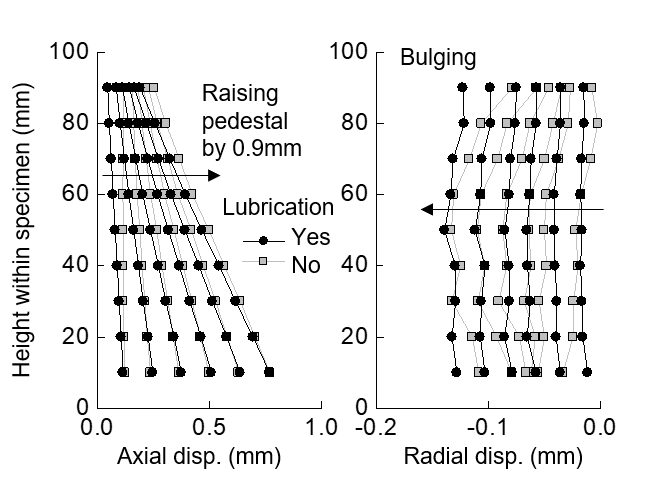 例:ポリウレタンダミー圧縮時の半径方向変位分布:端面潤滑の効果が明白
